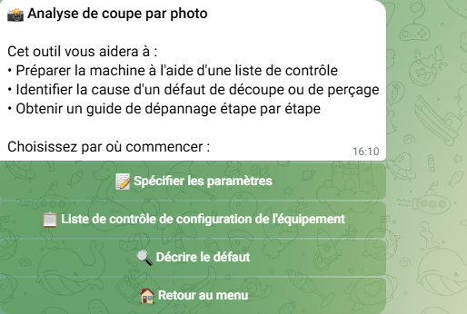 - Envoyez des photos — le bot peut analyser les photos de bord de découpe pour le diagnostic de défauts