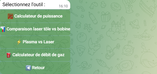 | 🧮 Calculateurs et Comparaisons ↓ | Calculateur de puissance, Tôle vs Bobine, Plasma vs Laser, Débit de gaz |