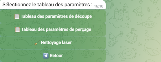 Appuyez sur 📋 Tableaux de Paramètres de Découpe/Perçage pour ouvrir le sous-menu :