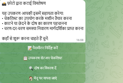 चरण 3 — Defect diagnostics: Defect को text में बताएँ या cut edge की फ़ोटो भेजें। बॉट इसे analyze करता है, defect database से मिलान करता है, और आपको देता है: