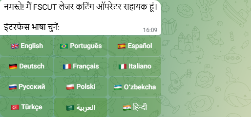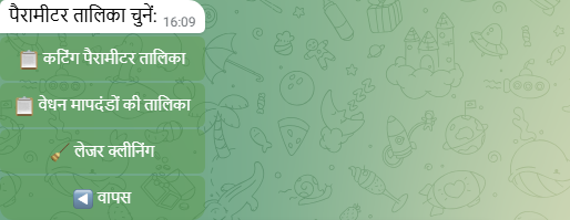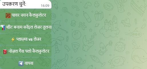 Material → thickness → power → gas चुनें। बॉट दिखाता है: