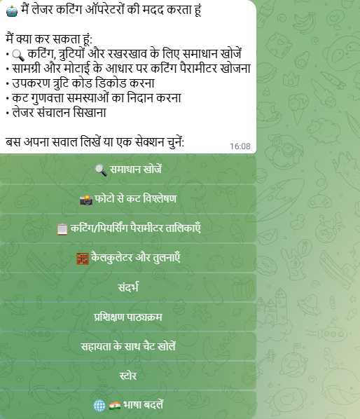 | Intelligent Search | Laser cutting के बारे में कोई भी सवाल सामान्य भाषा में पूछें — बॉट error codes, manuals और cutting modes में से जवाब ढूँढ़ता है |