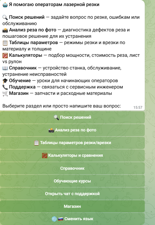 SBM Laser Help — бесплатный Telegram-бот, который помогает операторам лазерной резки диагностировать дефекты, находить параметры и устранять проблемы — без ожидания сервисного инженера.