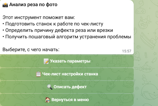 - Отправляйте фото — бот анализирует фото кромки реза для диагностики