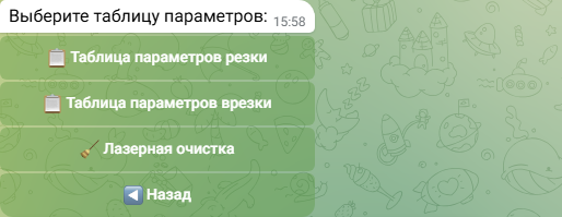 | 📋 Таблицы параметров резки/прошивки ↓ | Параметры резки и прошивки |